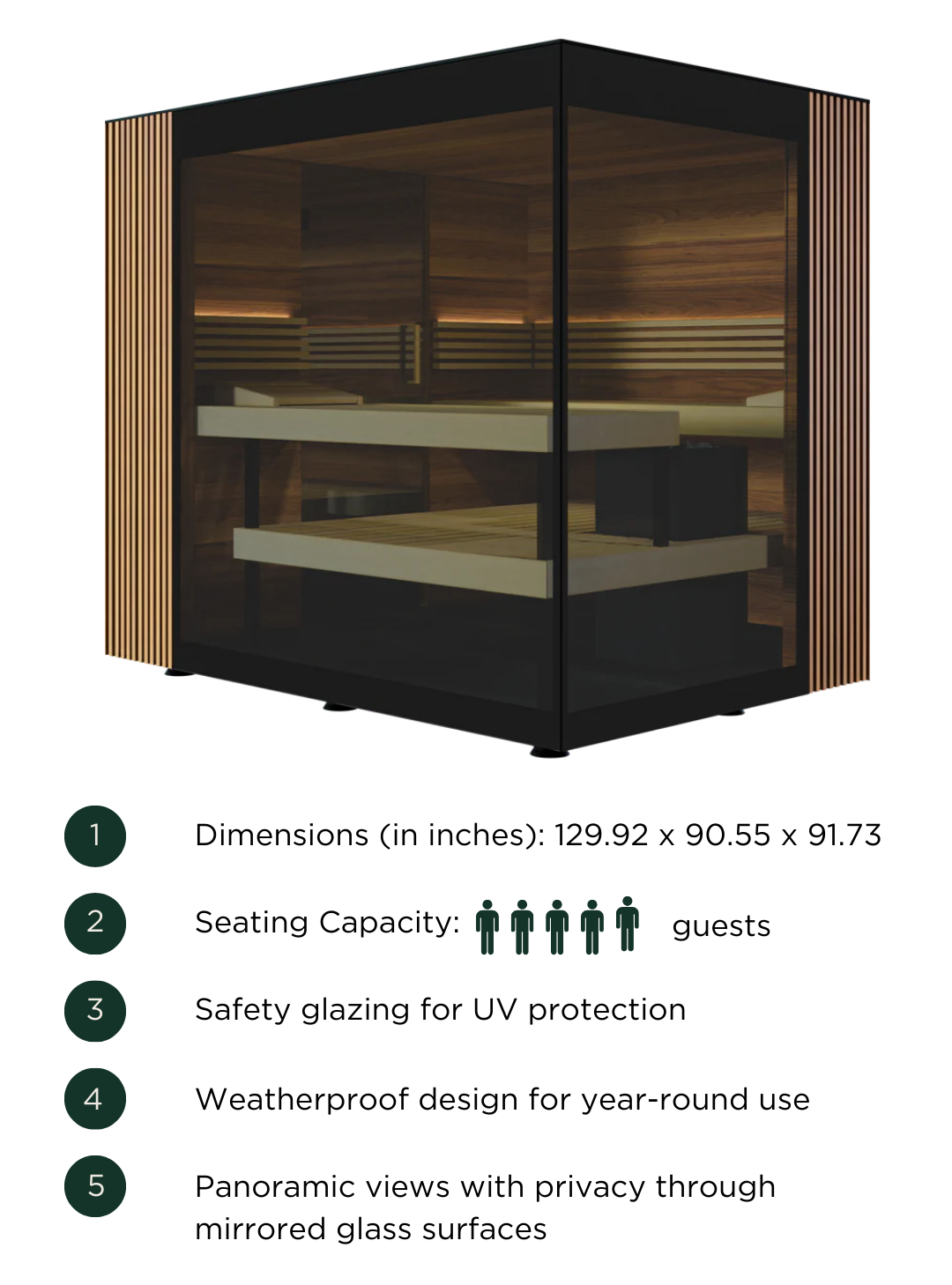 This advanced glass glazing features a reflective coating that creates a mirror effect, significantly reducing the amount of solar radiation entering the sauna. It helps to create a more comfortable and energy-efficient sauna experience. The reflective feature also provides privacy from the outside while maintaining a clear view from the inside
