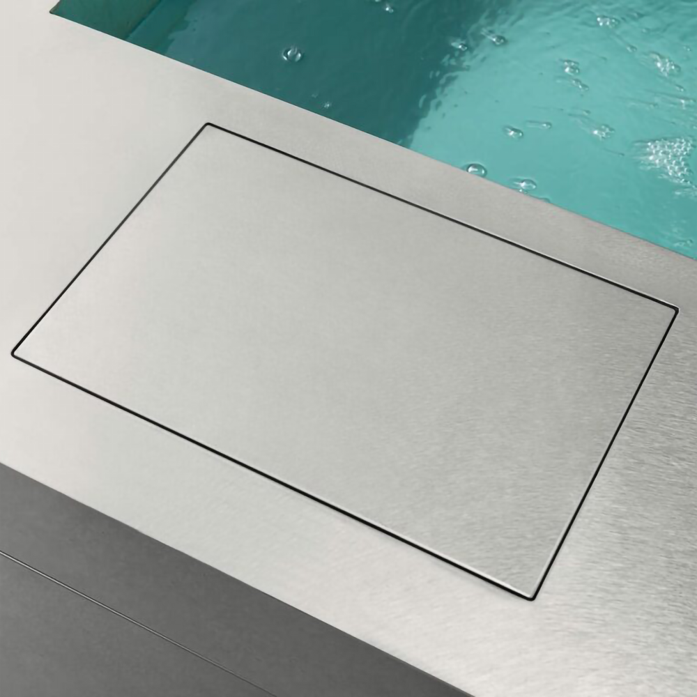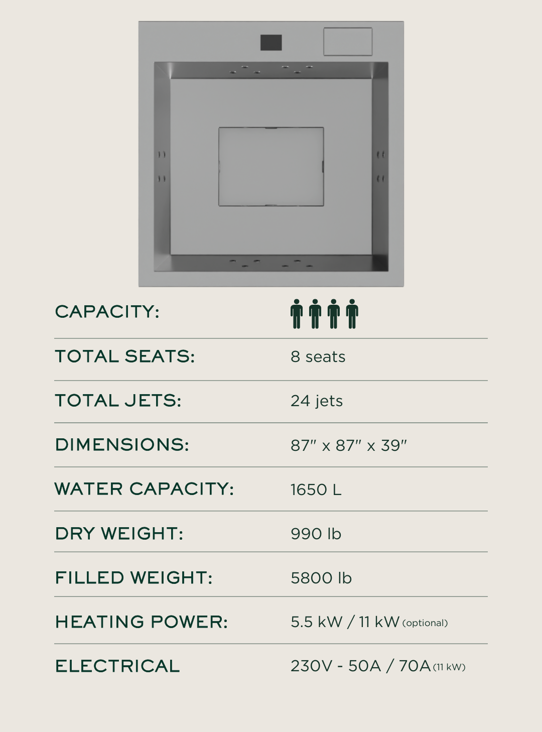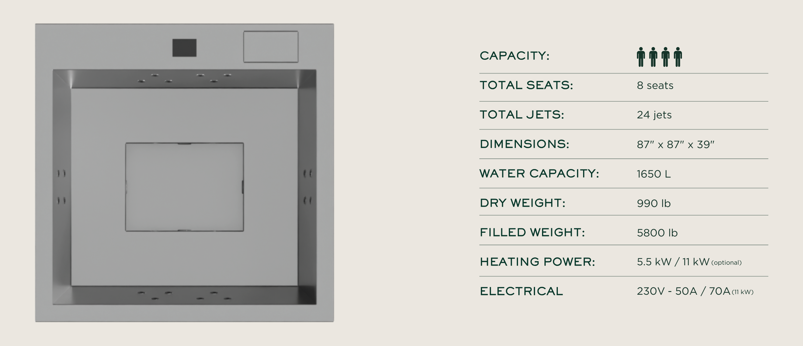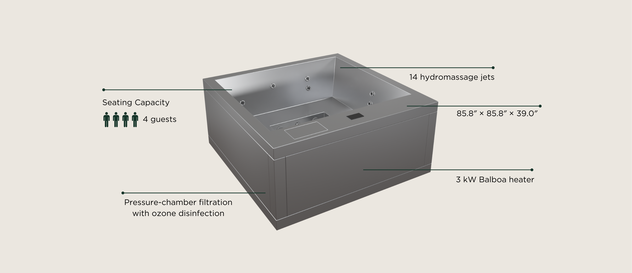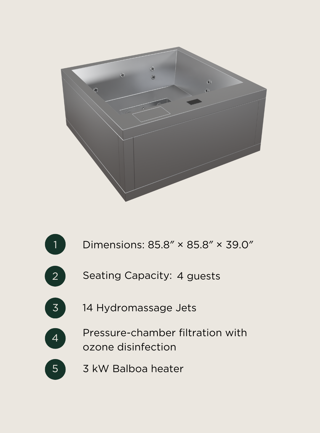 The Ember spa showcases a sleek V4A stainless-steel shell with seamless cladding, forming a modern, minimalist cube measuring 85.8″ × 85.8″ × 39.0″—ideal for elevating any terrace or backyard with its refined metallic finish and robust outdoor durability.