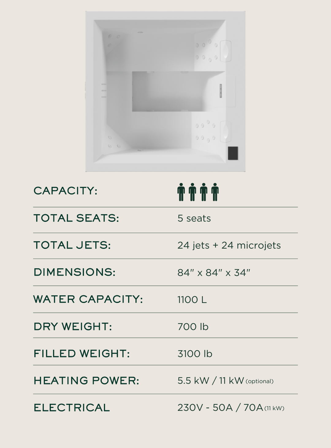 Inside, the layout is intentionally composed for comfort and flow: deep seating zones and a distinctive center lounge invite you to stretch out and fully unwind. Sleek jets deliver a smooth, balanced hydrotherapy experience. We prioritize your well-being with advanced filtration technology designed to maintain crystal-clear water, ensuring every soak is fresh and pristine. With effortless digital controls at your fingertips, you can curate your perfect temperature and mood in seconds.
