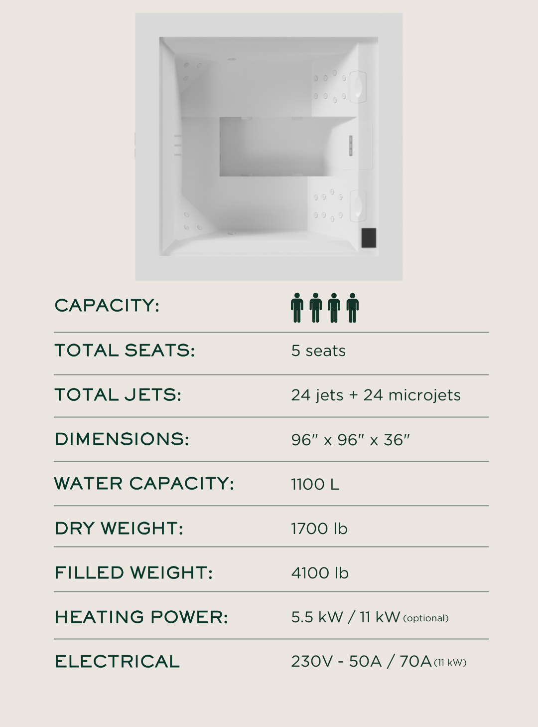 Experience the intentional flow of its interior, featuring deep seating zones and a distinctive center lounge that invites you to stretch out and fully unwind. Sleek jets deliver a smooth, balanced hydrotherapy experience ideal for quiet recovery or shared downtime. We prioritize your well-being with advanced filtration technology designed to maintain crystal-clear water, ensuring every soak is fresh and pristine. With effortless digital controls at your fingertips, you can curate your perfect temperature and mood in seconds.