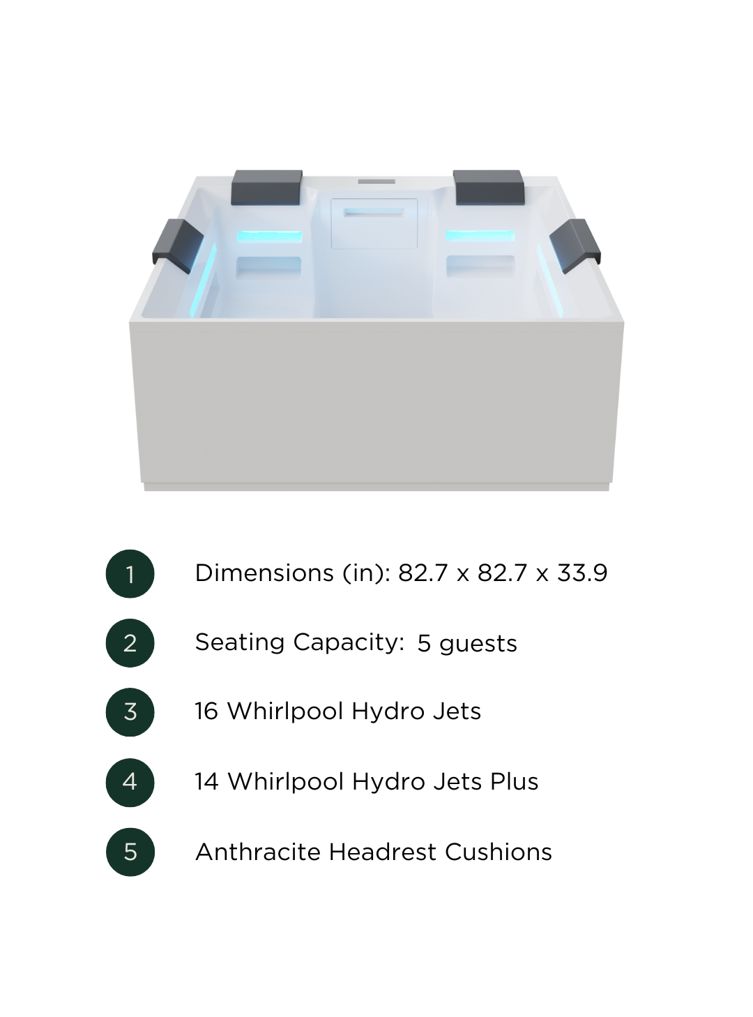 The Heaven spa features a Ghost Plus hydromassage system with Airpool jets and LED chromotherapy, delivering a professional-grade hydrotherapy experience that soothes and revitalizes every muscle . Designed with lower seating to immerse users up to the shoulders and enhanced backrests for superior support, its elegant satin white or black paneling and anthracite cover ensure a sophisticated aesthetic in any luxury environment. Measuring 82.7 × 82.7 × 33.9 inches with a 3–5 guest capacity, the Heaven balances a generous footprint with a sleek profile, complemented by two small and two large anthracite headrest cushions for tailored comfort.