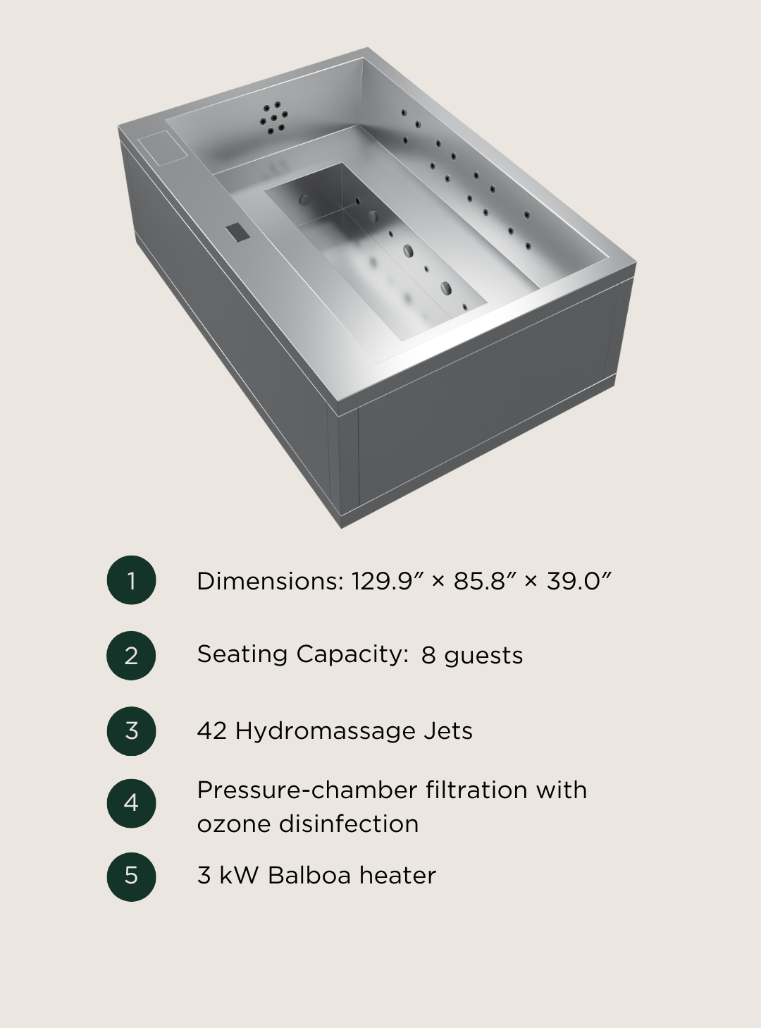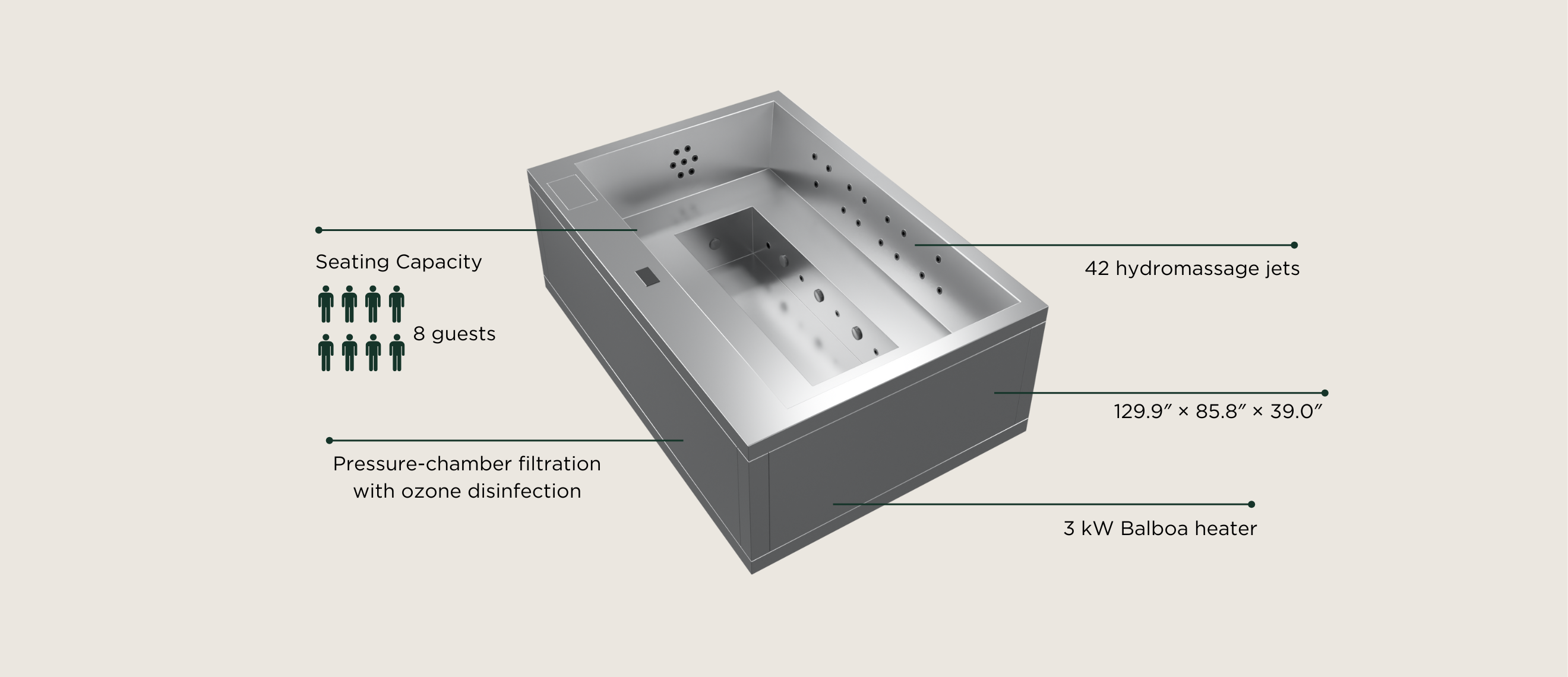 The Mirage spa showcases a V4A stainless-steel shell with seamless cladding, forming a contemporary cube measuring 129.9″ × 85.8″ × 39.0″, perfect for making a bold statement in any outdoor setting with its polished metallic aesthetic and superior weather resistance.