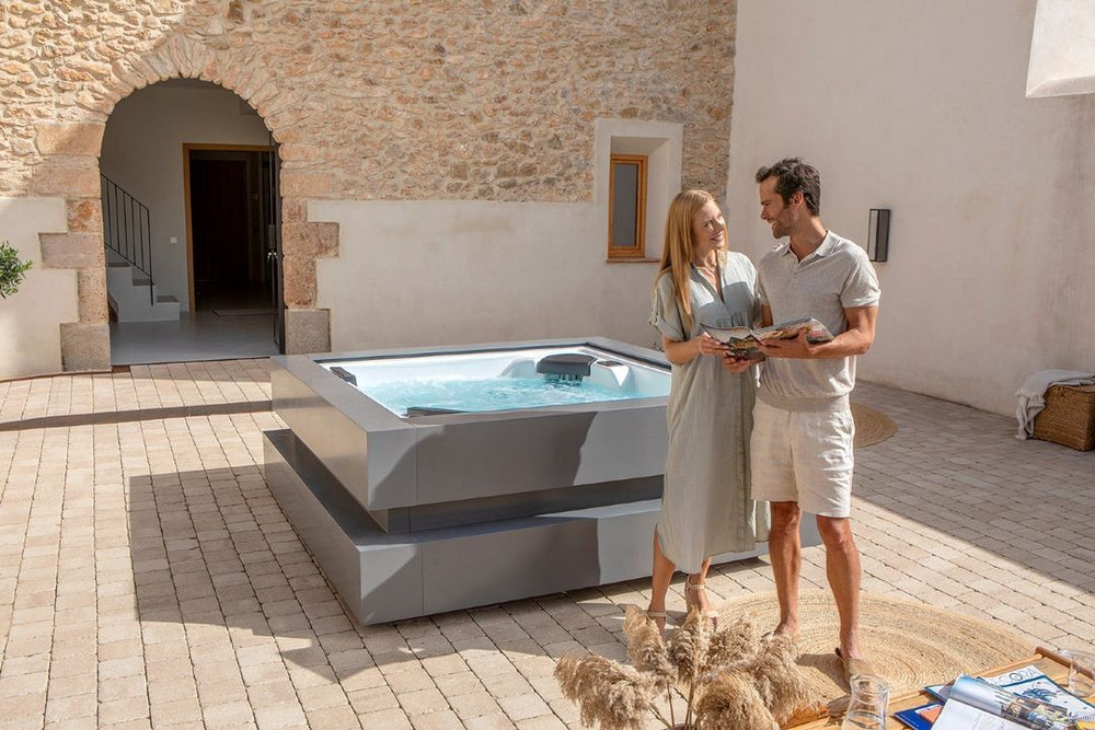 The Onyx spa embodies ultra-modern luxury with its V4A stainless-steel shell and seamless cube design measuring 155.1″ × 85.8″ × 39.0″, providing an expansive footprint that elevates any premium outdoor retreat with its striking metallic lines.