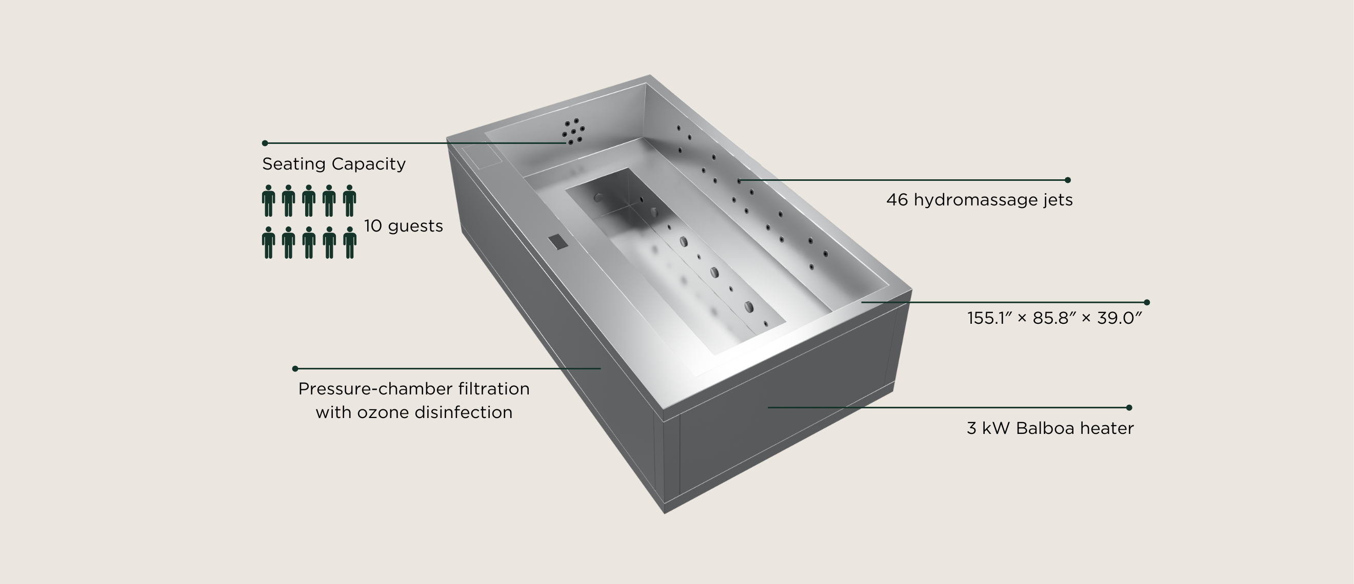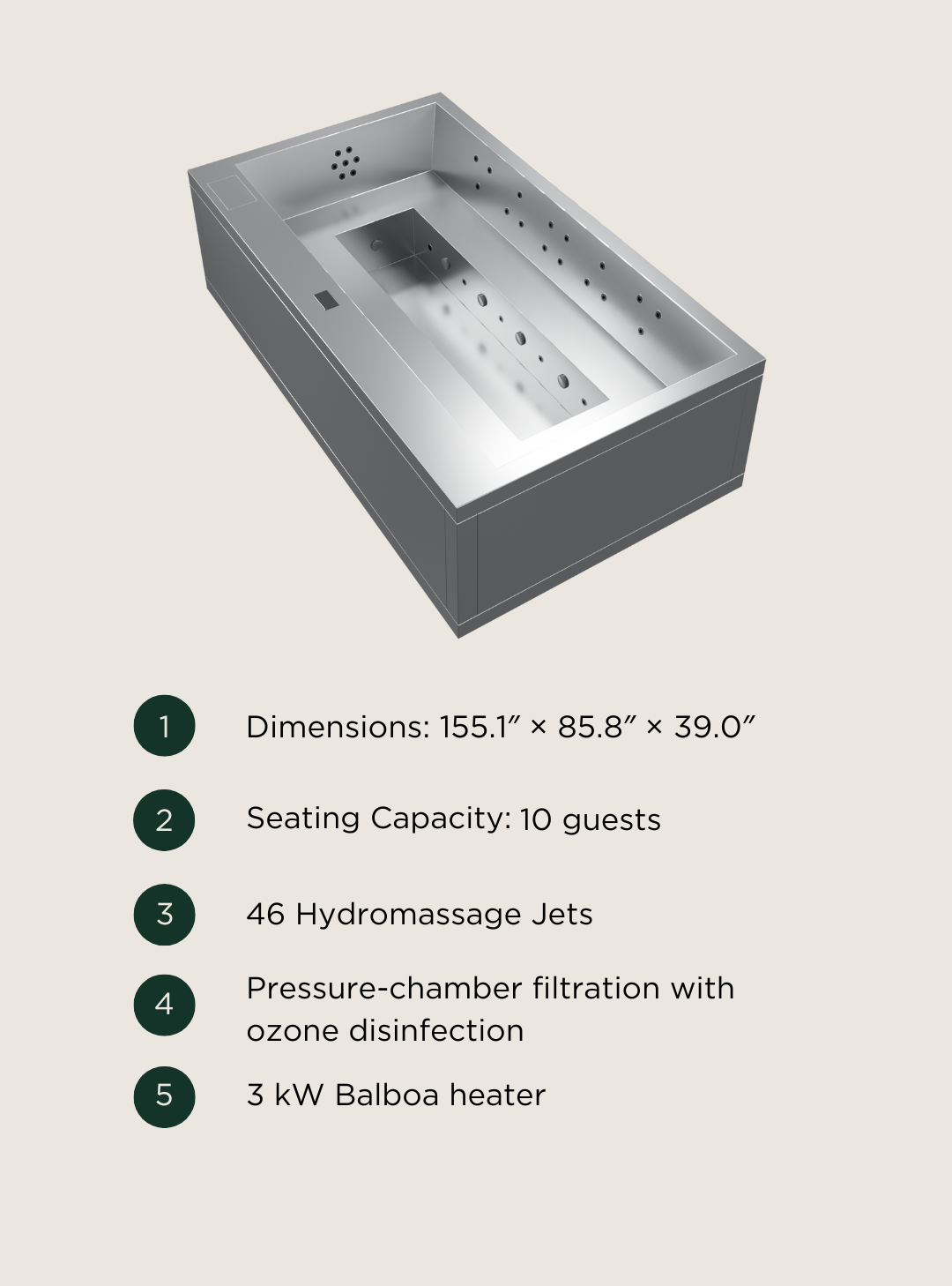 Configured for up to ten seats, Onyx features 40 dynamic hydromassage jets driven by a dedicated massage pump, alongside a 3 kW Balboa heater, ozone purification, pressure-chamber filtration, and immersive chromotherapy lighting, all seamlessly integrated under a Wi-Fi-ready control panel for a profoundly restorative, bespoke hydrotherapy experience.