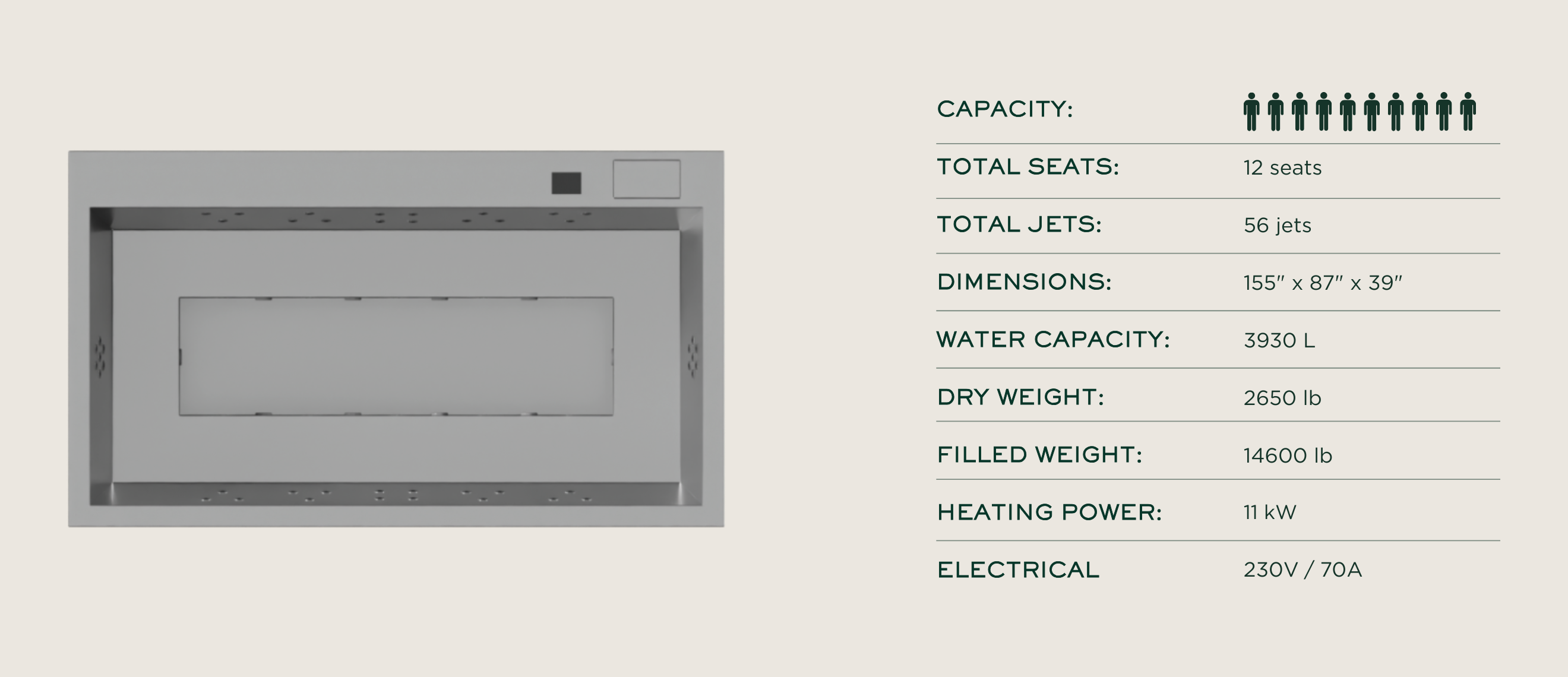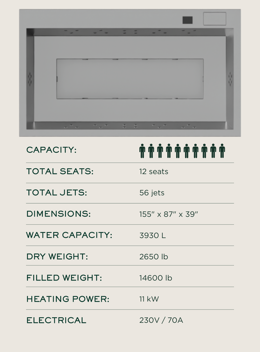 Configured for up to ten seats, Onyx features 40 dynamic hydromassage jets driven by a dedicated massage pump, alongside a 5.5 kW Balboa heater, ozone purification, pressure-chamber filtration, and immersive chromotherapy lighting, all seamlessly integrated under a Wi-Fi-ready control panel for a profoundly restorative, bespoke hydrotherapy experience.