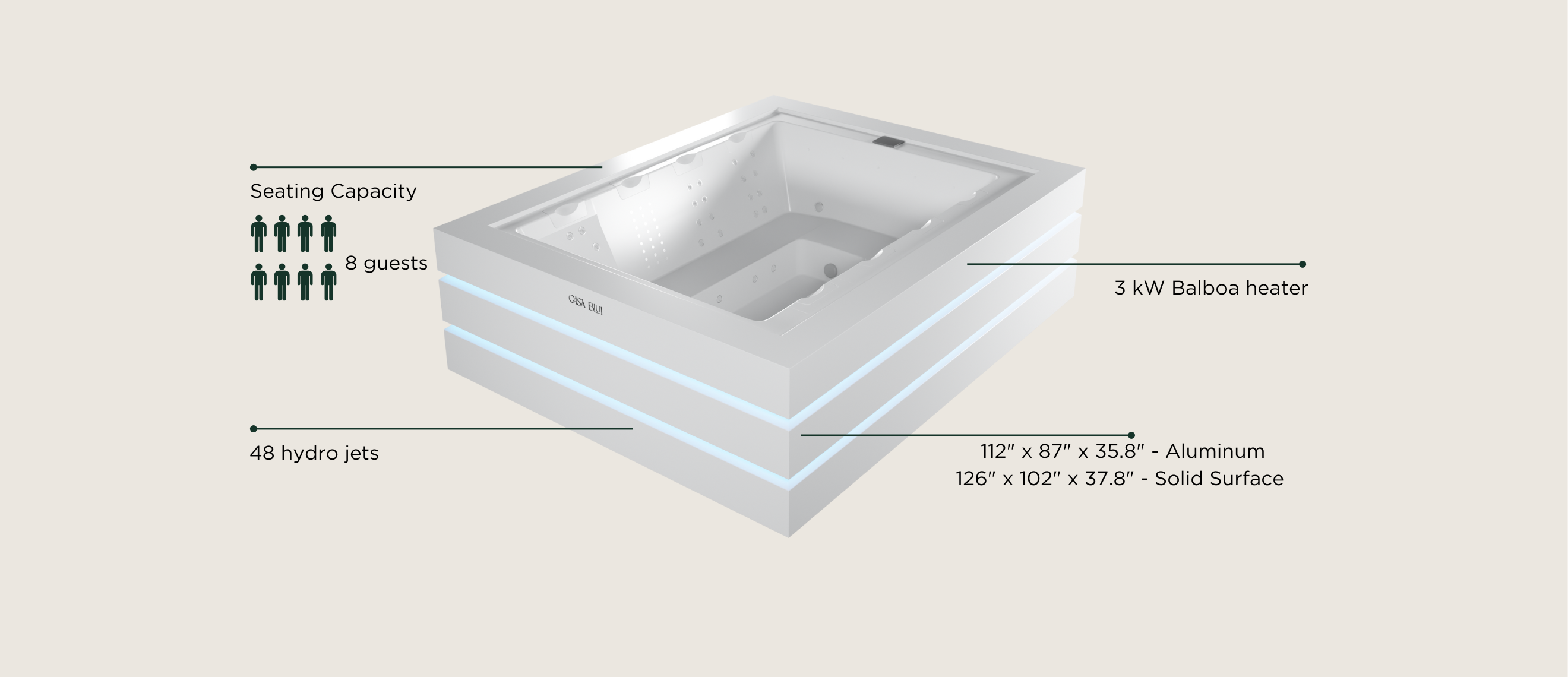 Opus luxury spa is designed to be a crisp, modern silhouette with clean lines and premium cabinet finishes. Seats up to eight, built to last, and ships with a matching cover.