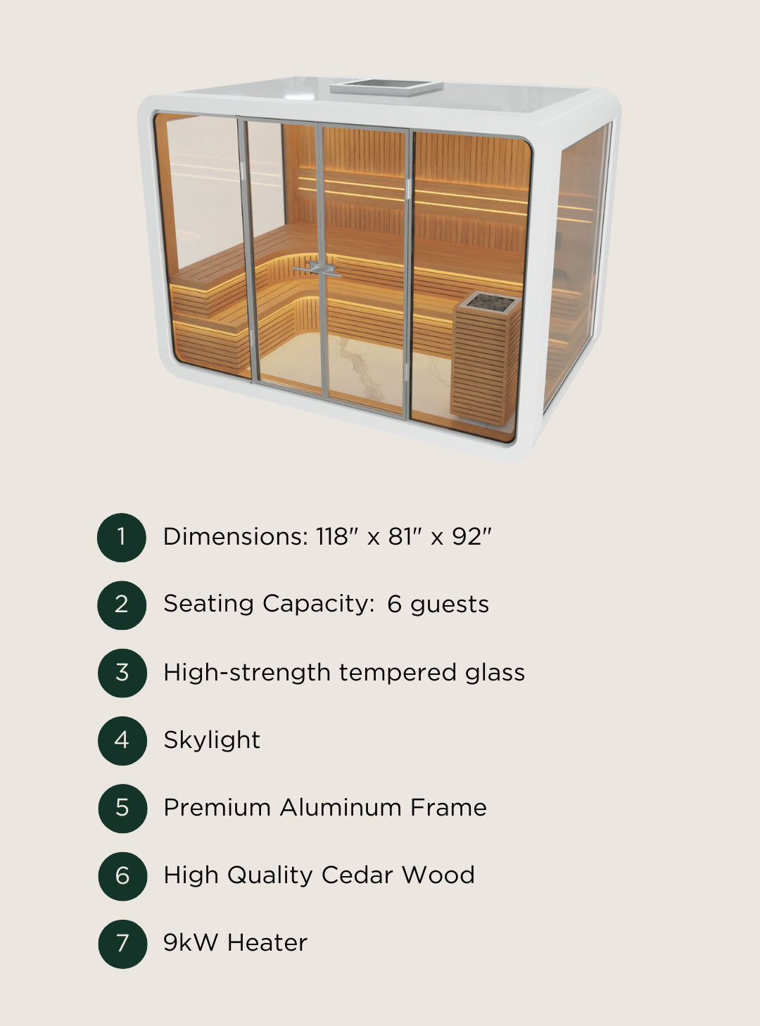 Monarc is the ultimate expression of sauna luxury: spacious, commanding, and designed to impress. Its expansive glass surfaces and pristine white frame create a panoramic, gallery-like presence, transforming any setting into a high-end spa environment. Step inside and you’re enveloped by warm wood, subtle integrated lighting, and a sense of openness that invites you to truly let go.