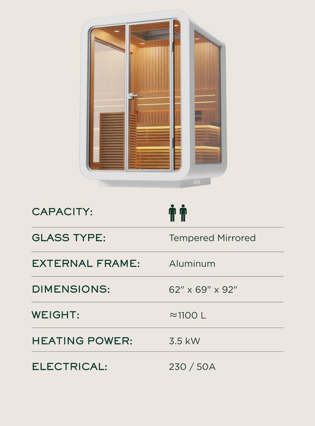 Step into a new era of relaxation with Vista, the compact modern sauna that turns any corner into a premium wellness escape. Its sleek glass walls and refined white frame create a bright, airy feel, while the warm wooden interior wraps you in comfort the moment you enter. Soft integrated lighting highlights every detail, setting a calm, sophisticated atmosphere that invites you to slow down and breathe.